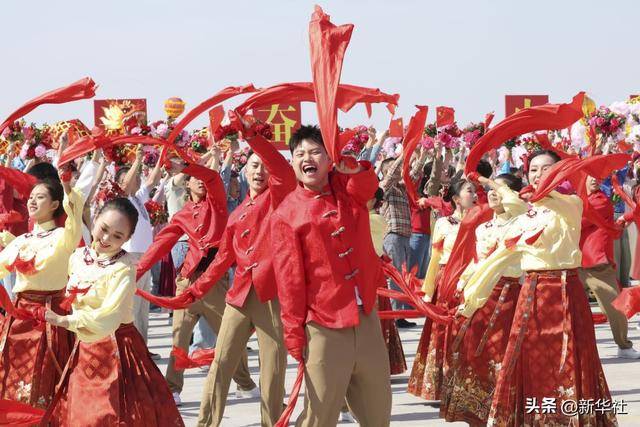 喜庆的乐曲声中人群欢腾,维吾尔族群众打起手鼓,哈萨克族群众高举礼盒,蒙古族群众挥舞哈达,回族群众手捧盖碗茶,柯尔克孜族群众弹起库姆孜,汉族群众打起大鼓……绚丽多彩的大地,朴实热情的人民。