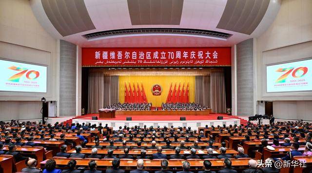 25日上午,新疆人民会堂,笑语欢声。会堂前广场,是两个巨大的红石榴景观造型。身着盛装的人群,从四面八方汇聚到这里,隆重庆祝自治区成立70周年。